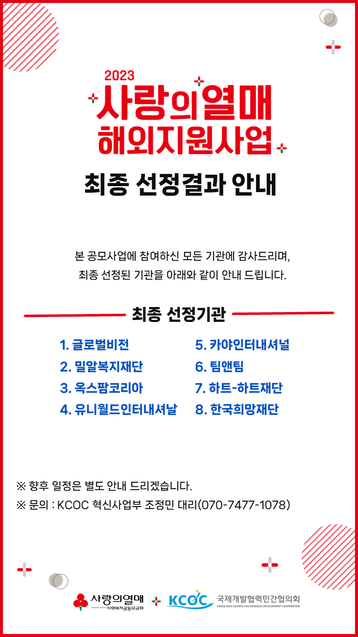 대신에 사랑의 열매에서 나눔과 꿈이 아닌 자체적으로 '글로벌 분야' 공모 사업을 시작했고 KCOC에서 동일하게 운영기관으로 이를 운영하게 되었습니다.