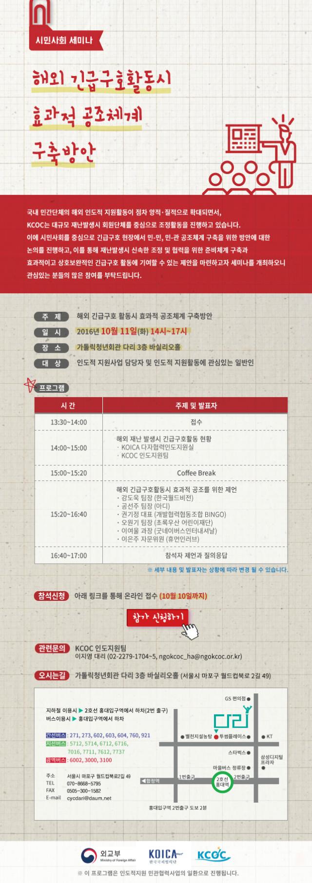 시민사회 세미나에 패널로 참여하여 아래와 같은 민-관,민-민 협력에 관한 제언을 드렸습니다.시간이 짧아 더 조리있게 말하지 못한 것이 못내 아쉽네요.효과적 인도적 지원 활동을 위해 우리 모두 지혜를 모아 봐요.