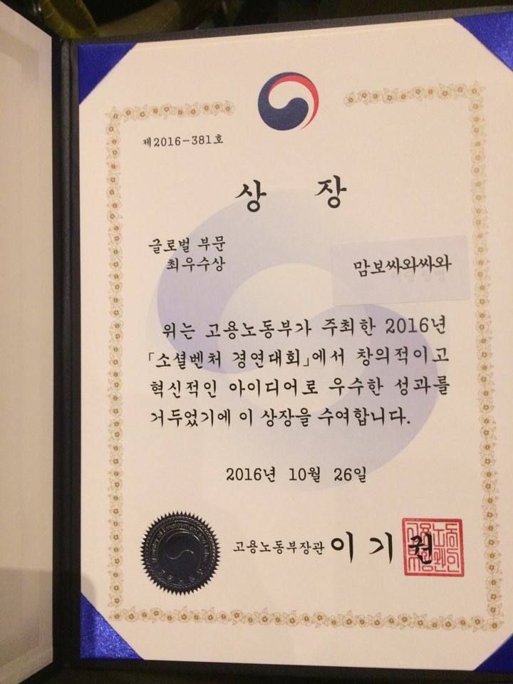 2016년 소셜벤처 대회 최우수상(고용노동부 장관상)을 수상하게 되었습니다. 좀 쑥스럽지만 부족한 저를 늘 따뜻하게 지켜봐주시고 응원해 주시는 모든 분들께 감사드리고자 페이스북에 포스팅해 봅니다.