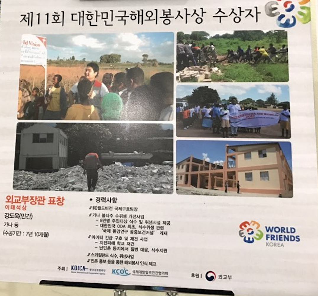 11월 25일은 대한민국이 2009년 OECD DAC(개발원조위원회)에 가입한 것을 축하하는 '개발 원조의 날'입니다. 이 날을 기념하는 자리에서 못난 제가 이태석 신부님의 정신을 기리는 '이태석상'을 수상하였습니다. 나의 자랑 아버지/어머니, 먼저 다가와 축하해 주신 박상원 코이카 홍보대사님, 잊지 않고 와 준 WV 가족들, 외교부/코이카 직원분들, 꽃을 선물해 주신 카이스트 동기님 등 정말 정말 감사합니다. :)