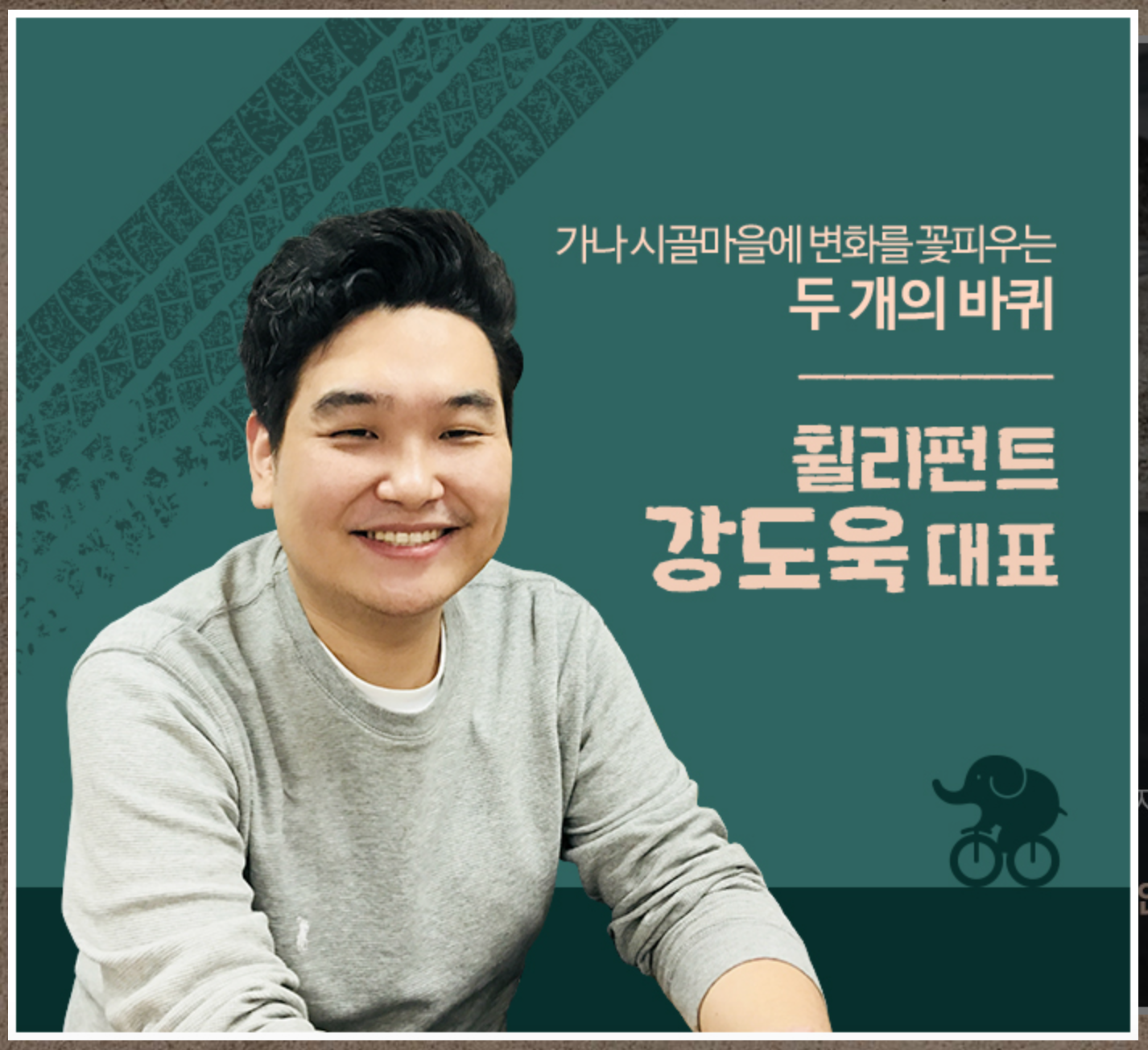 SK 행복나눔재단에서 제가 가나에 설립한 휠리펀트를 카드 뉴스로 만들어 ‘소셜 이노베이터’란에 소개해 주셨습니다.(한번 읽어 보세요 ㅎㅎ) 부족해서 쑥스럽지만 너무 큰 감동을 받았습니다! 가나 시골 마을에 살때 주민들과 함께 상상했던 일이 현실이 되었습니다. 제 첫번째 커리어 10년이 humanitarian worker 였다면 두 번째 커리어는 social innovator로서 내가 사는 지역사화와 지구촌 문제를 풀어나가는게 아닌가 싶습니다. 휠리펀트가 주민들에게 아무런 가치를 줄 수 없어질때까지 휠리펀트는 계속 됩니다. 🙂