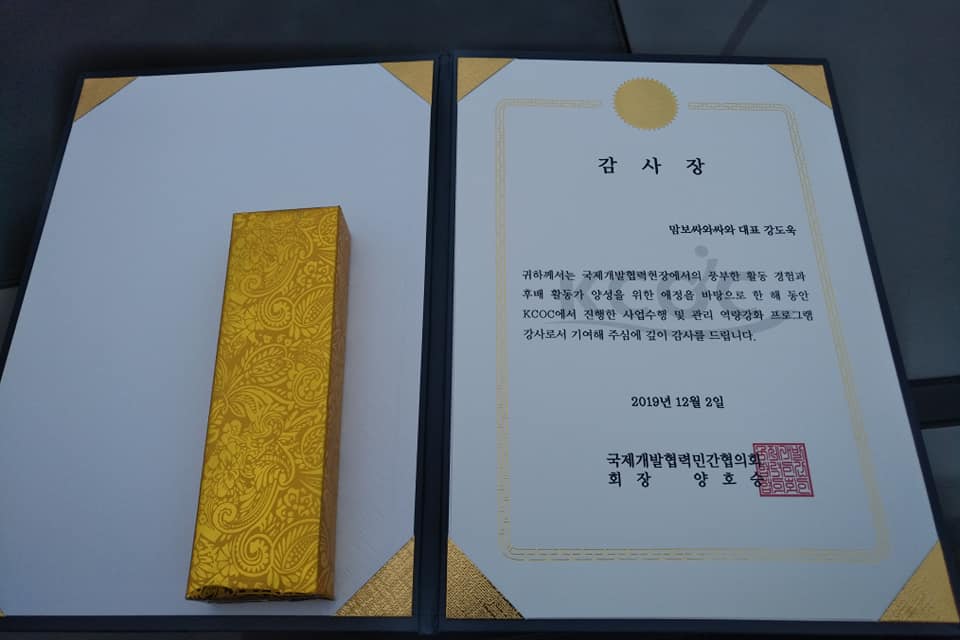 국제개발협력 협의체로 부터 감사장을 받다. 나에게는 정말 큰 상 201912