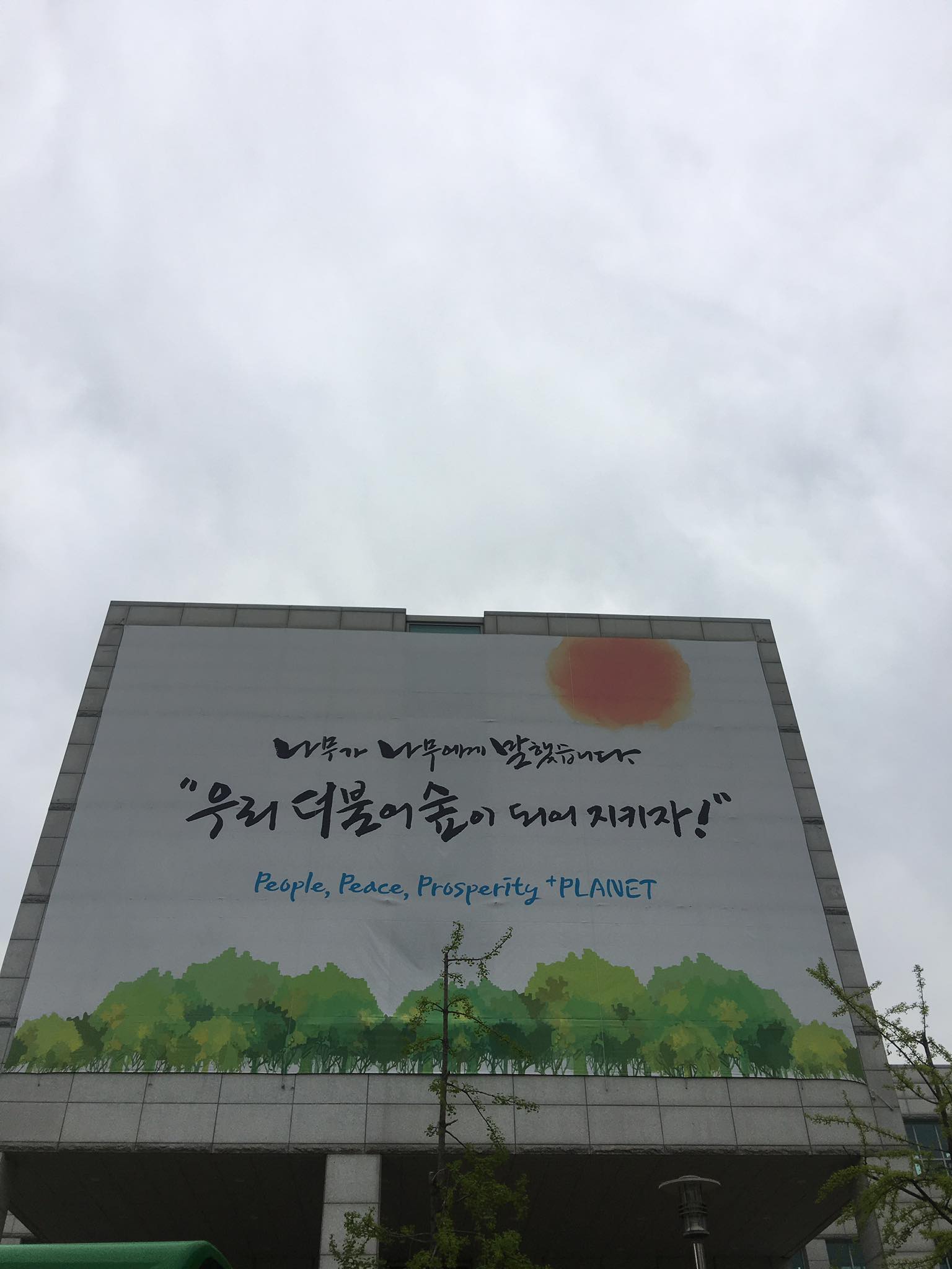 멋진 문구가 건물 외관에 걸려있습니다. 나무가 나무에게 말했습니다. “우리 더불어 숲이 되어 지키자.”